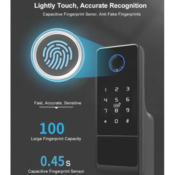 Tuya smart lock is lightly touch,accurate recognition, support capacitive fingerprint sensor, anti fake fingerprints with fast accurate sensitive. Support large fingeprint capacity 100, capacitve fingerprint sensor 0.45 second. Lightly touch, accurate recognition, capacitive fingerprint sensor, anti fake fingerprint.